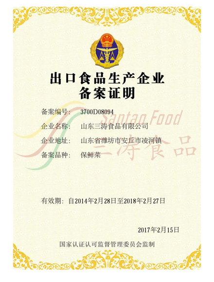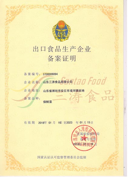 保鮮菜出口備案證明 -