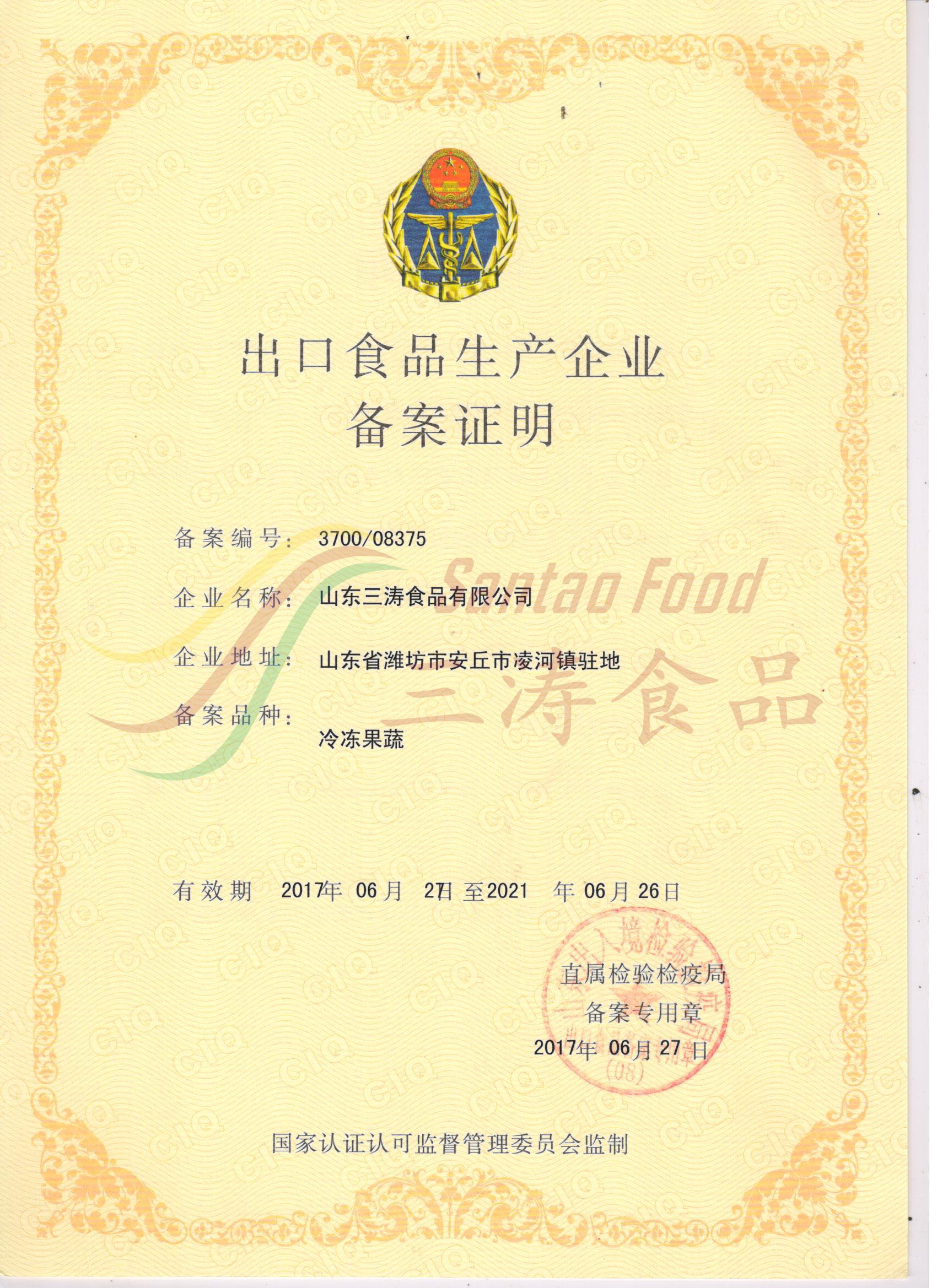 冷凍果蔬出口備案證明 -